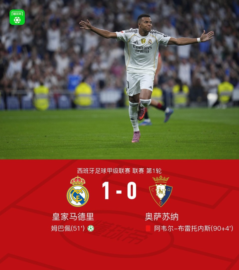 皇马1-0奥萨苏纳迎开门红,姆巴佩点射,马斯坦托诺西甲首秀_1