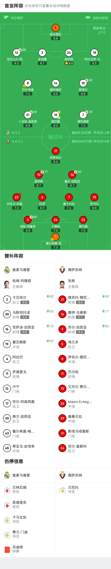 第68分钟,皇马换人,马斯坦托诺上演西甲首秀,卡瓦哈尔回归