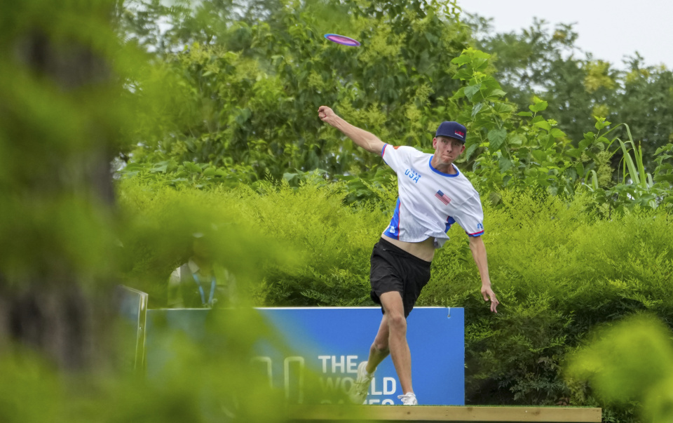 8月9日,美国队选手布尔在比赛中掷飞盘。最终,美国队战胜爱沙尼亚队,晋级决赛。新华社记者 陈欣波 摄