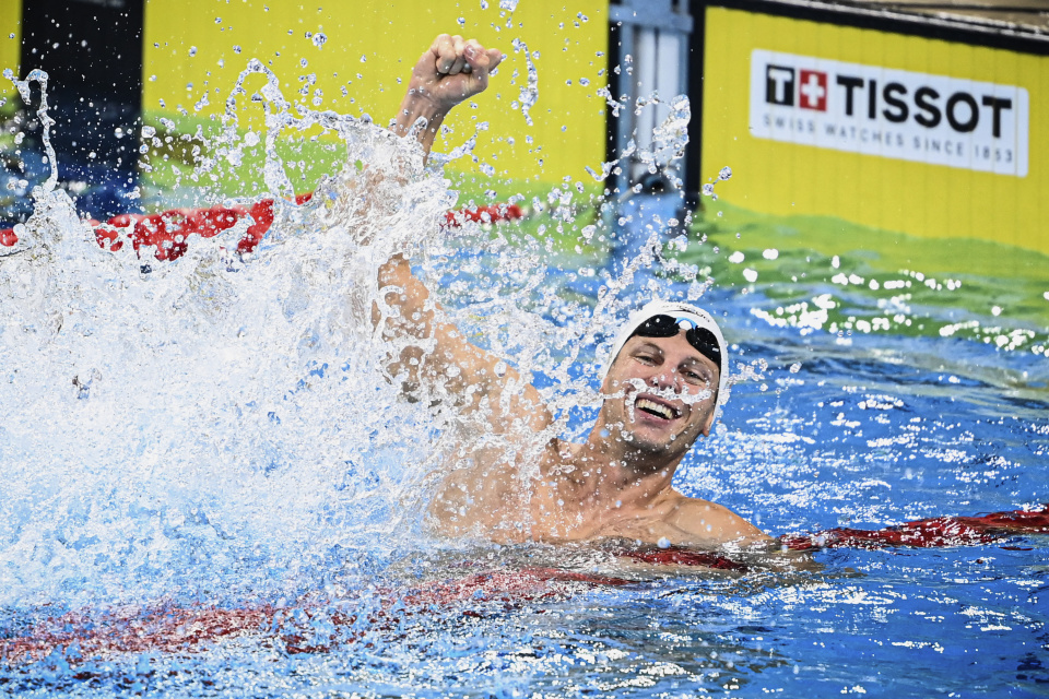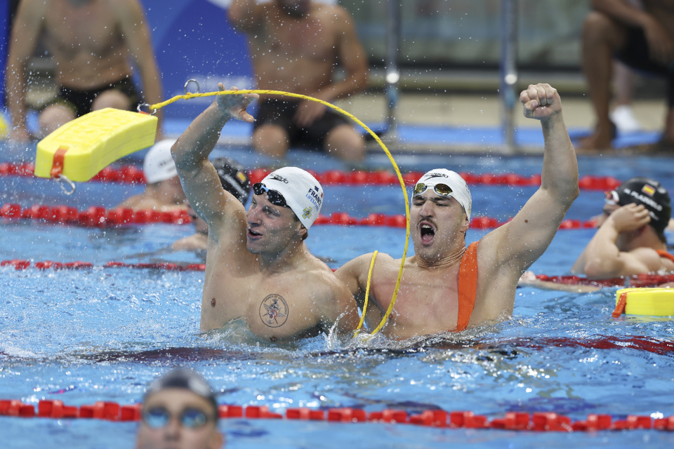 8月9日,法国队选手拉塞尔在比赛后庆祝。最终,法国队夺得冠军并创造该项目新的世界纪录。新华社记者 江汉 摄