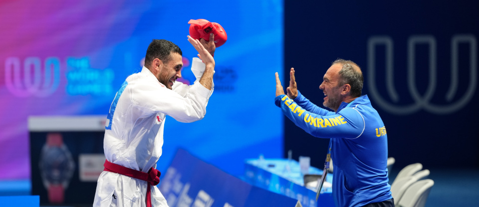 8月9日,乌克兰选手塔利博夫(左)在夺冠后与教练庆祝。新华社记者 江宏景 摄