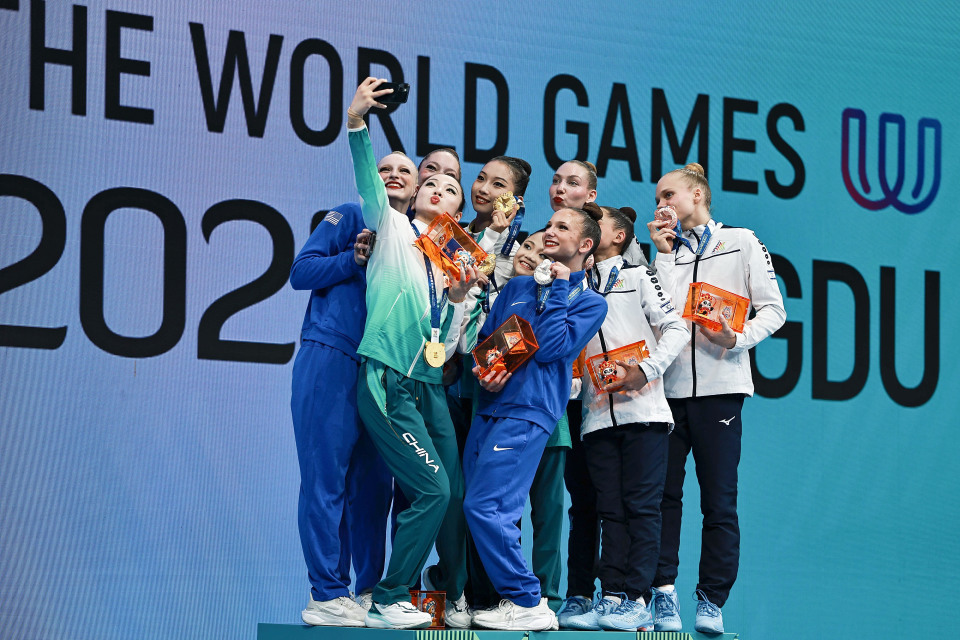 8月9日,冠军中国队、亚军美国队和季军以色列队队员在颁奖仪式后自拍。新华社记者 孙凡越 摄