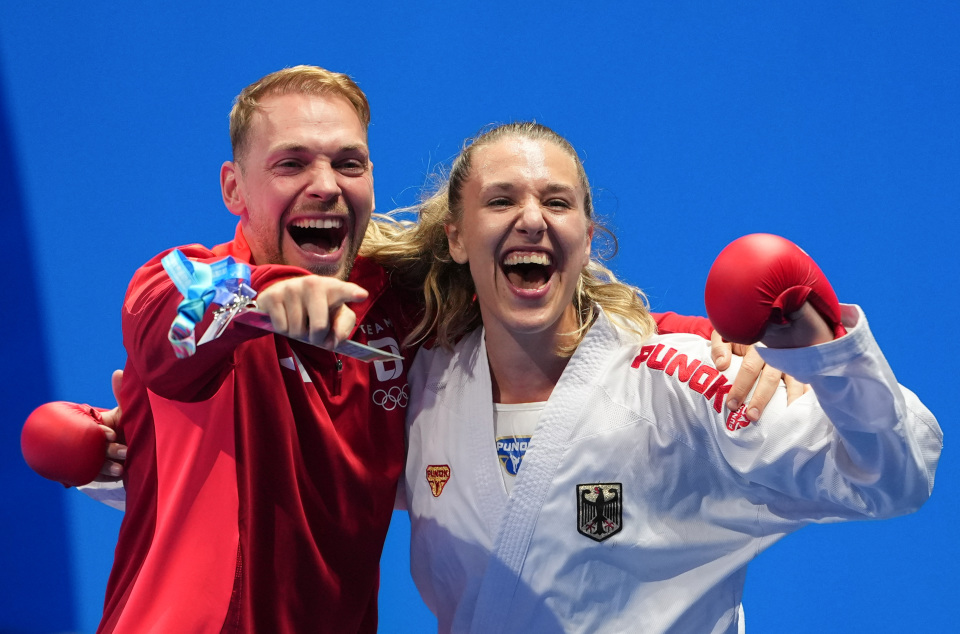 8月9日,克内尔(右)夺冠后与教练庆祝。新华社记者 江宏景 摄