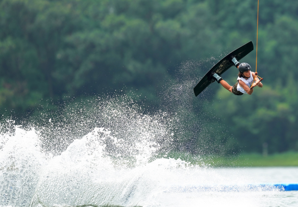 8月9日,美国选手克劳迪奥在男子索道滑水复活赛中。新华社记者 贝赫 摄